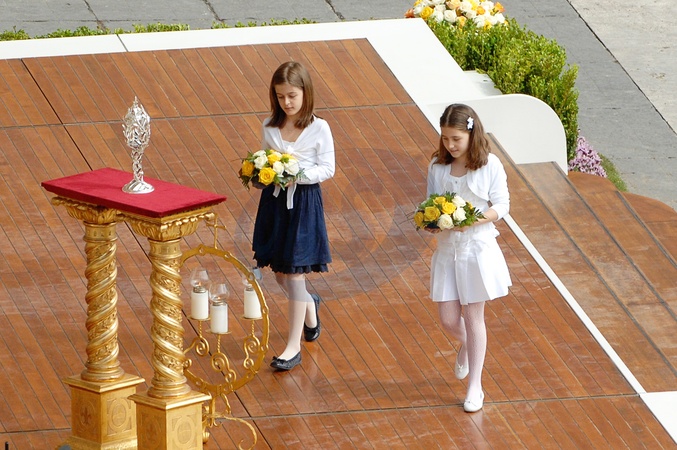 Uzdrowiona przez Jana Pawla II Marie Simon-Pierre i siostra Tobiana, niosa relikwiarz z ampulka jego krwi