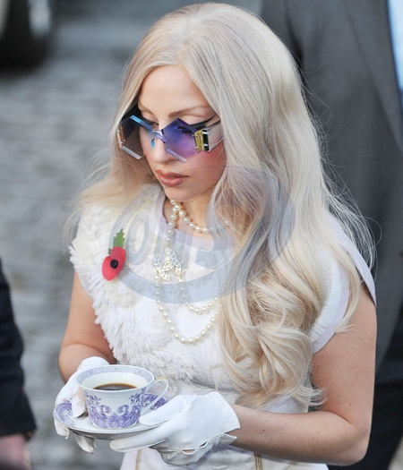 Lady Gaga z filizanka kawy wychodzi z hotelu, Londyn