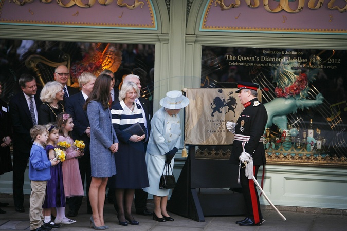 Krolowa Elzbieta II, ksiezna Camilla i ksiezna Kate podczas wizyty w sklepie Fort and Mason, Londyn