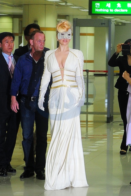 Lady Gaga w sukni Versace na lotnisku w Seulu