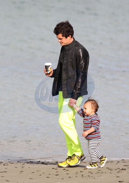 Orlando Bloom z synkiem na plazy w Wellington, Nowej Zelandia