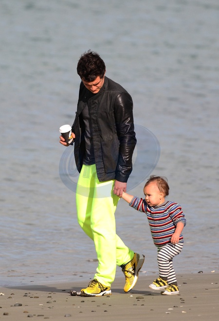 Orlando Bloom z synkiem na plazy w Wellington, Nowej Zelandia